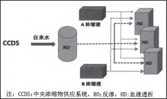 A、B粉經過集中供濃縮液系統(Central Concentrate Delivery System,CCDS)溶解為濃縮液,經過系統內部一系列檢測,合格后通過專用管道將濃縮液輸送至透析機。
