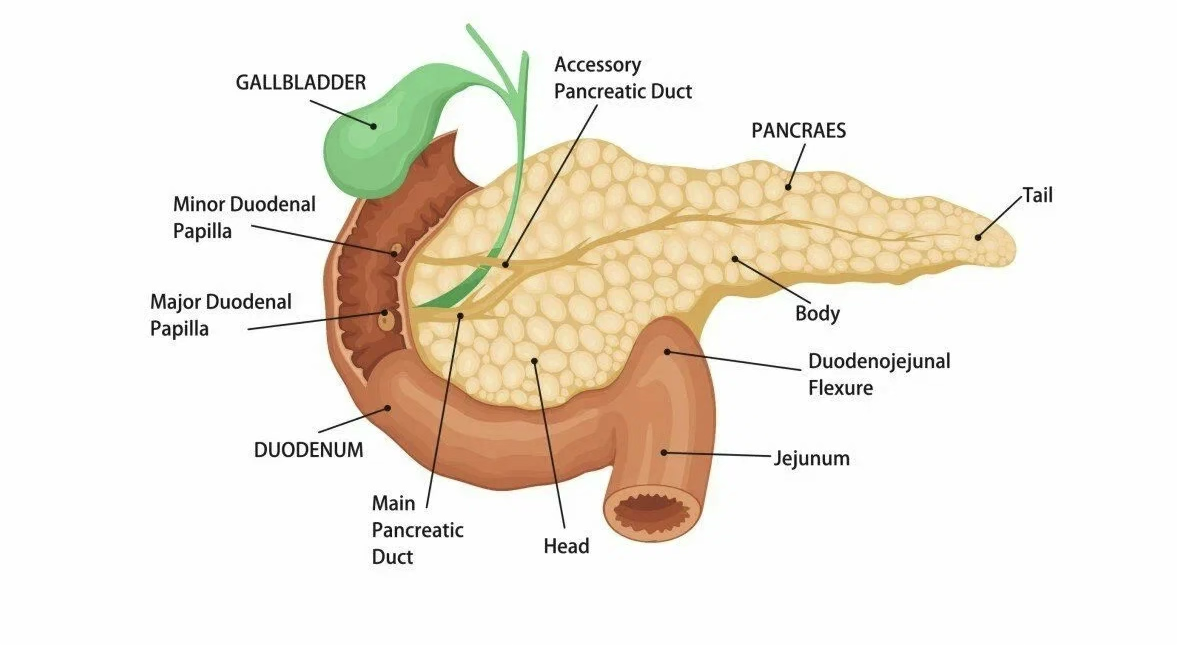 胰腺(Pancreas)是人體重要的消化和內分泌器官。它是一個狹長的腺體,深埋于上腹部,躲在胃的后面,平時X光平片是看不到胰腺的。胰腺具有外分泌和內分泌的作用。一方面,胰腺分泌含有多種消化酶的胰液,比如胰淀粉酶、胰蛋白酶和脂肪酶,幫助分解碳水化合物、蛋白質和脂肪,促進營養物質的吸收。另一方面,胰腺中的胰島分泌胰島素和胰高血糖素,這些激素調節血糖水平,保持體內血糖的平衡。