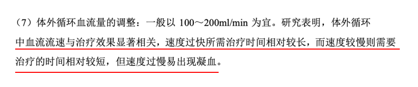 血液灌流治療時,血流量的設定直接關系到毒素清除的效果和體外循環(huán)的安全性?!堆簝艋瘶藴什僮饕?guī)程》(2021版)中明確指出血液灌流治療時,體外循環(huán)的血流量范圍為100-200ml/min。規(guī)程認為,如果血流速度過快,治療效果可能不佳,因此治療的時間會變長;而如果血流速度過慢,則有凝血的風險。因此推薦血流速度為100-200ml/min。